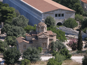 "Now while Paul waited for them at Athens, his spirit was provoked within him when he saw that the city was given over to idols. Therefore he reasoned in the synagogue with the Jews and with the Gentile worshipers, and in the marketplace daily with those who happened to be there." Like today in Athens, there were probably a lot of sellers of icons and other idols. This is the view looking almost straight down and slightly to the right from Areopagus, while on it. This photo also includes a view of an 11th century Byzantine church, which was built on the site of the ancient nymphaion in the Athens marketplace (the church is not called "the Church of the Holy Apostles").