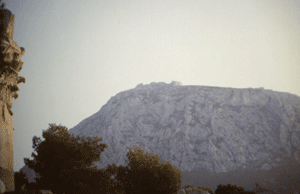 This is a massive rock stucture next to Corinth. Its top once contained a whole town. Now it has ruins of a temple and other ancient buildings.