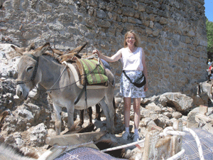 A photo of Joyce and the donkey she road to get to the acropolis. This one actually ran up the hill quite fast.