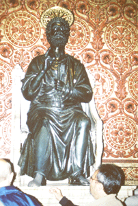 This dark bronze statue used to be lower down and people used to kiss of the large toes (we saw this our first visit). It was kissed so much that the metal wore away so much that that particular toe now is blended in with the rest of the foot. Perhaps for reasons of sanitation, the Romans raised this statue to prevent kissing it. Now, visitors touch the toe instead of kiss it. Some have claimed that this actually is a statue of Juno and not Peter. It is my understanding that if it is Juno, this statue was made after the time of Christ. No one knows what Peter actually looked like and it is not likely that he looked as portrayed by this statue.