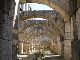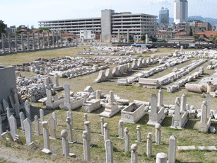 More Ancient Smyrna. Ancient agora ruins with some modern buildings in the background.